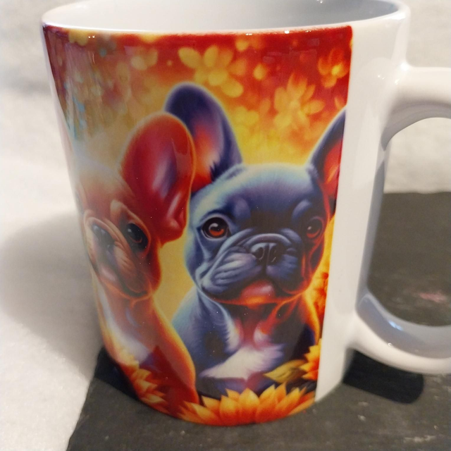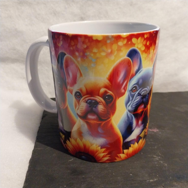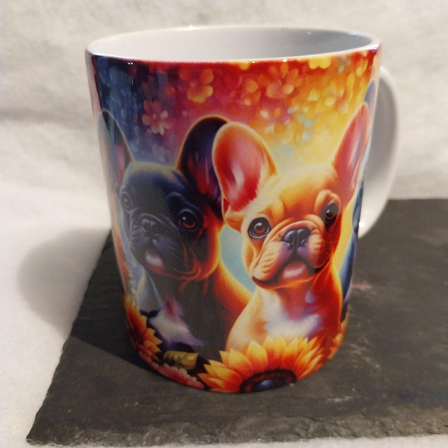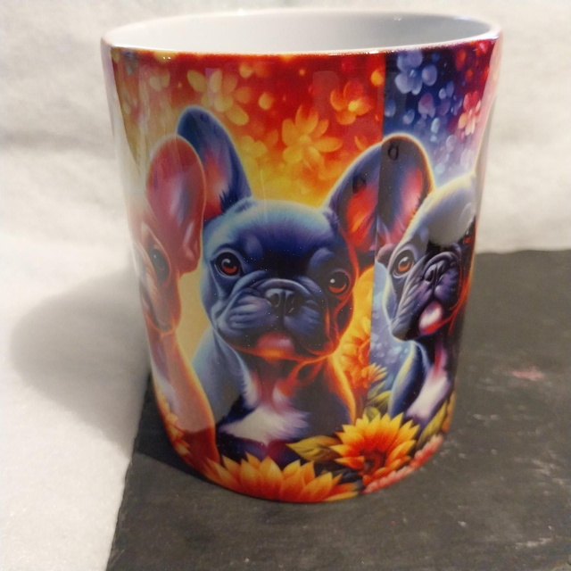 Joli mug coloré, avec ces bouledogues multicolores .